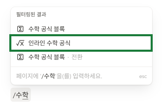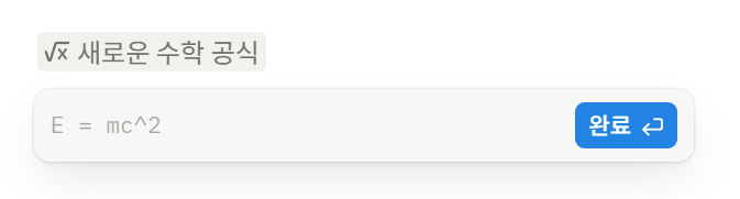 노션 페이지에 /수학 공식을 입력하거나 Ctrl/Cmd + Shift + E를 눌러 수식 블록을 생성합니다.